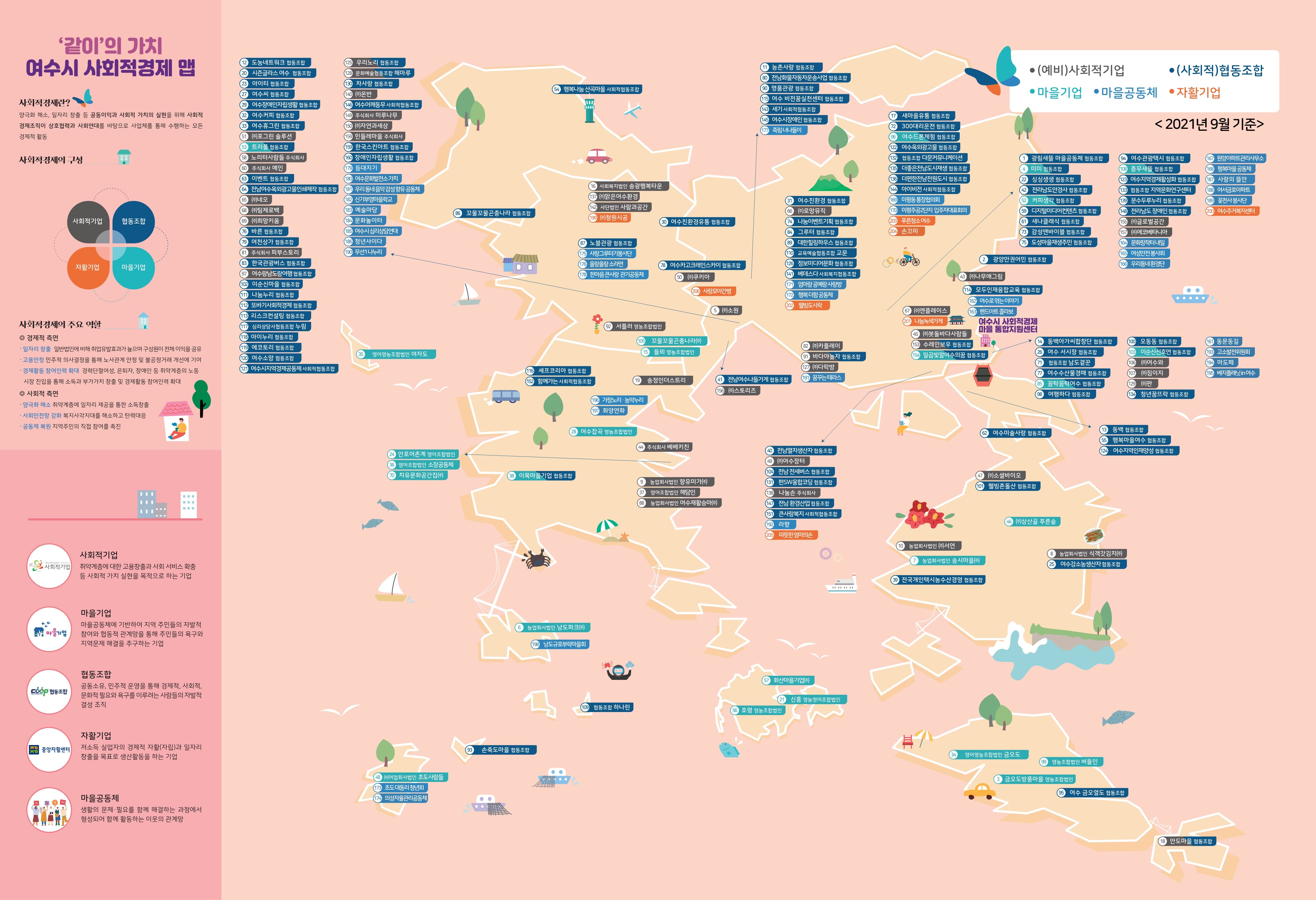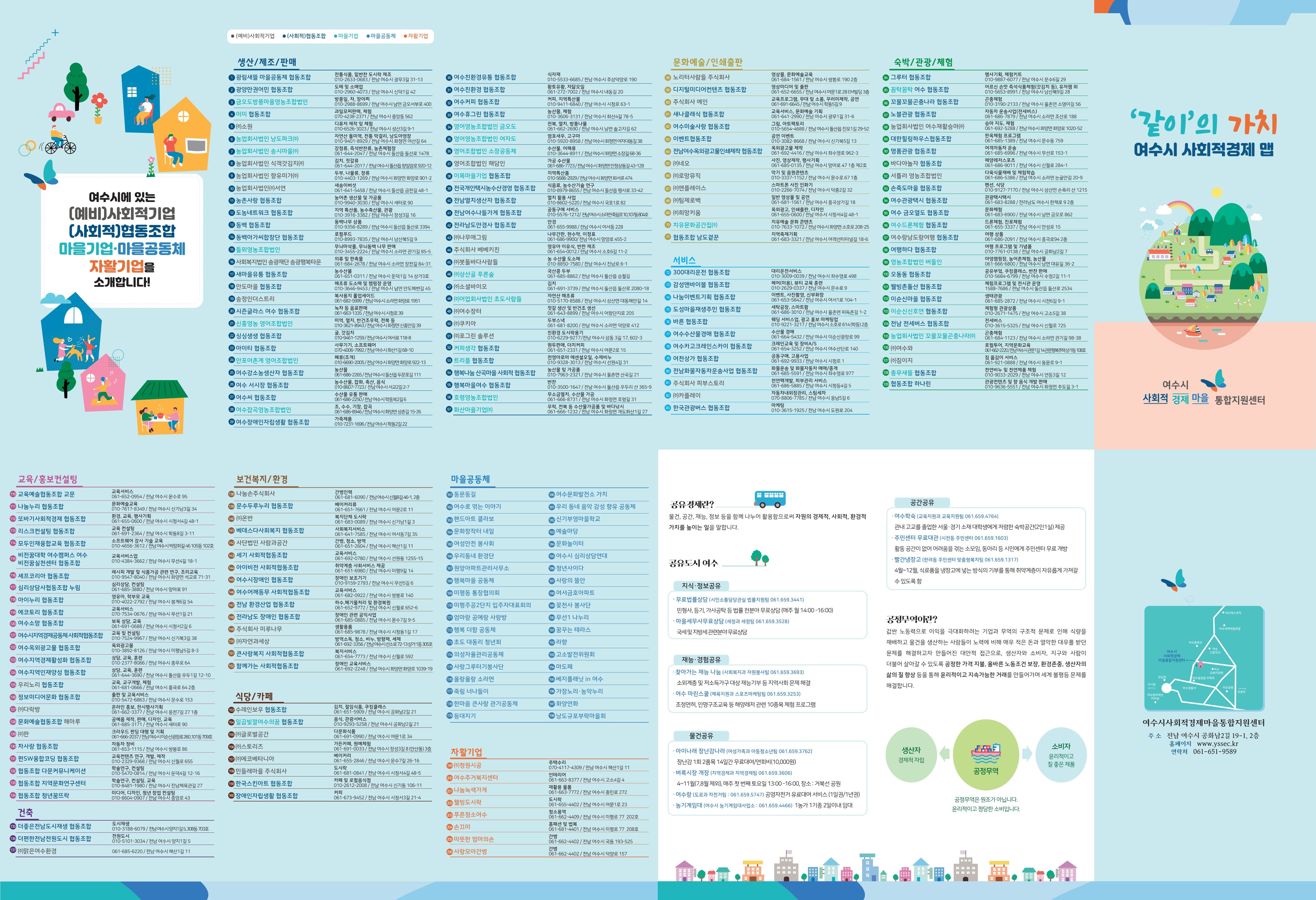 여수시 사회적경제마을통합지원센터에서 여수의 사회적경제 기업들을 소개하고 다양한 정보를 효과적으로 전달하고자 기획, 제작, 무료 배포하고 있는 지도입니다.
