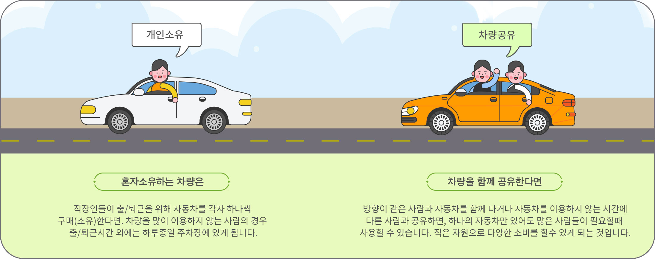 - 제한된 자원을 여러 사람이 함께 사용함으로써 자원절약과 함께 환경보호를 직접 실천하게 됩니다.