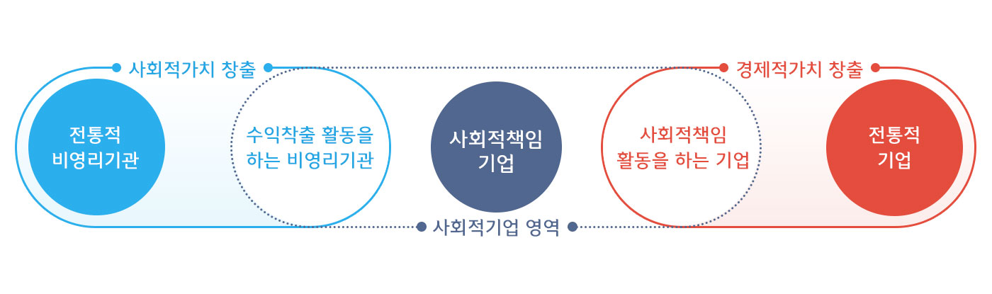 - 사회적기업이란 영리기업과 비영리기업의 중간 형태로, 사회적 목적을 우선적으로 추구하면서 재화ㆍ서비스의 생산ㆍ판매 등 영업활동을 수행하는 기업(조직)을 말함