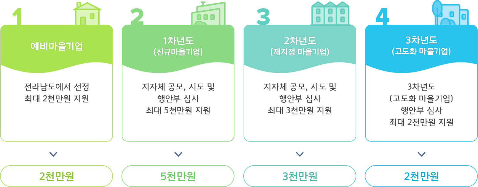 | 신규채용 인건비 최대 5년간 지원 * 예비사회적기업 2년, 사회적기업 3년 기타(경영컨설팅, 사업개발비)지원 | 지원내용 | 시설비, 경영컨설팅 등 사업비 2년간 최대 8천만원 전라남도 예비 마을기업 운영 2천만원 |